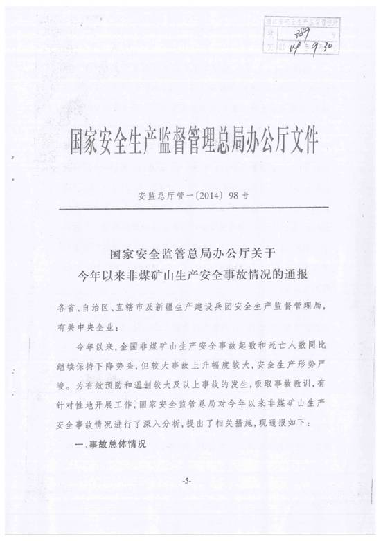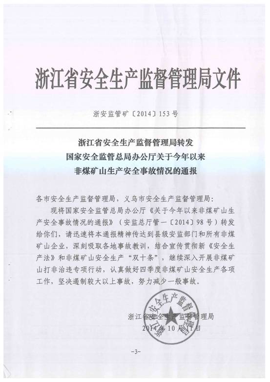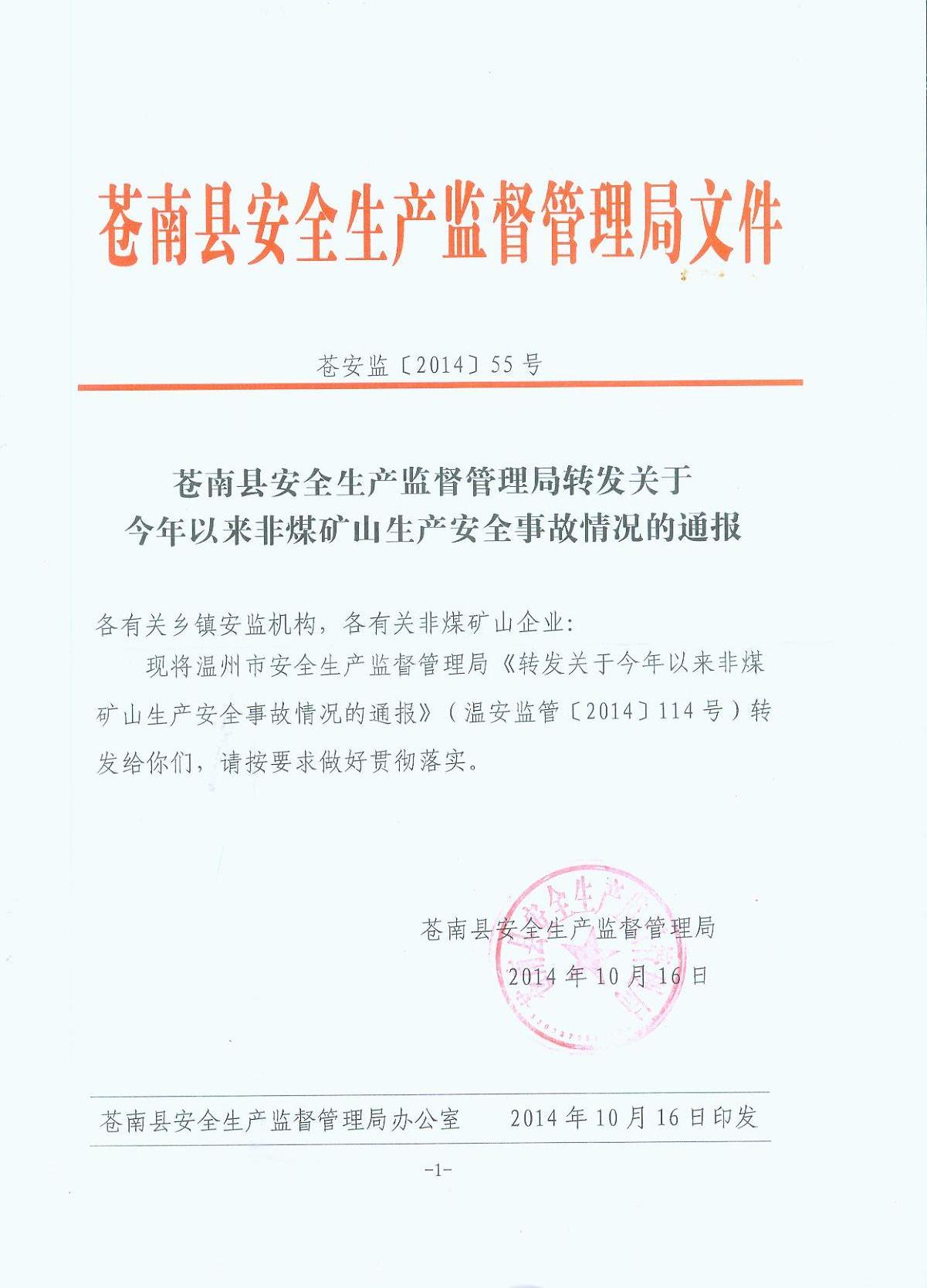 現將蒼南縣安全生產監督管理局《轉發關于今年以來非煤礦山生產安全事故情況的通報》(蒼安監[2014]55號)轉發給你們,請按要求做好貫徹落實。